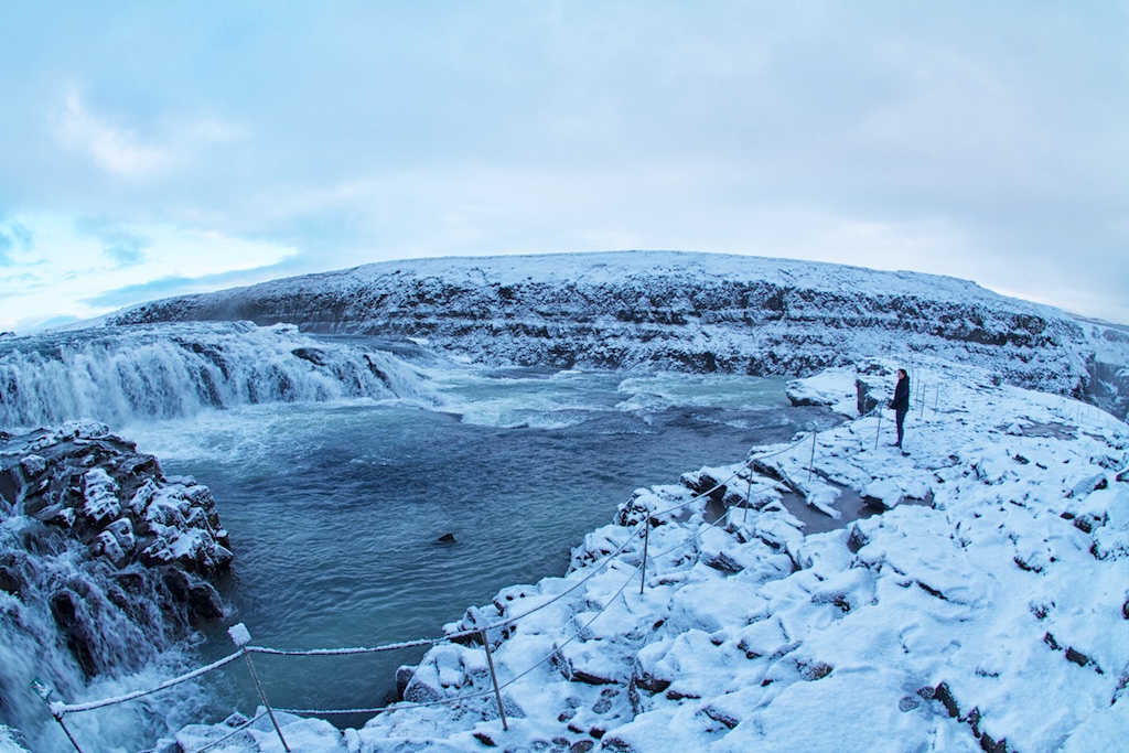 When we arrived at the Gulfoss car park we weren't completely sure where we were because all the signposts had been coated white by the overnight snow. We had just parked up where there were a few cars and a couple of coaches to have a look at why they had stopped here and then realised we had arrived. We walked around the gift shop and headed down the steps to another car park which is the one which can be seen on the webcam at the Live from Iceland website (unfortunately the site doesn't appear to be functioning properly at the time of writing). This first shot is from a viewing point at the edge of the car park showing the view up the river with the two part of the falls in the foreground.